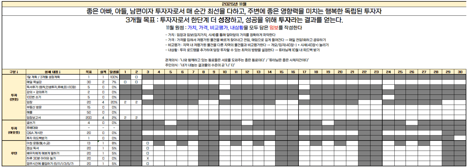 어느덧 11월의 절반이 지났습니다. 10월과 마찬가지로 11월 계획했던 일들과 현재 진행 상황에 대해 복기하고 놓친 부분에 대해서 체크하고 더 나은 방향을 고민해보는 시간을 가져보려고 합니다. 이제 두 번째 임장지의 최종 임장보고서 제출도 1주일 앞으로 다가온 상황인데요. 남은 시간 동안에 꼭 목표를 달성할 수 있도록 해보겠습니다.