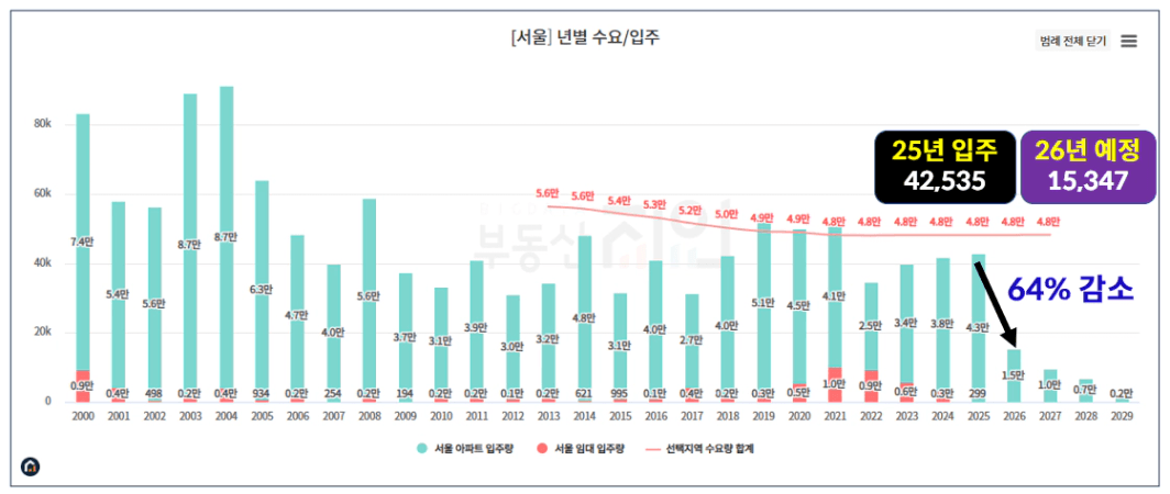 2026년 서울 입주물량은 2025년 대비 64% 감소합니다.