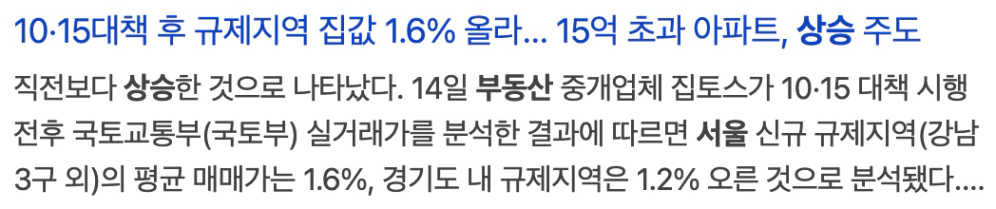 특히 10.15 대책으로 대출 규제, 토지허가구역, 규제지역 확대 등 강도 높은 조치들이 시행되었지만 시장가격은 규제의 강도 만큼 꺾이지 않았습니다.