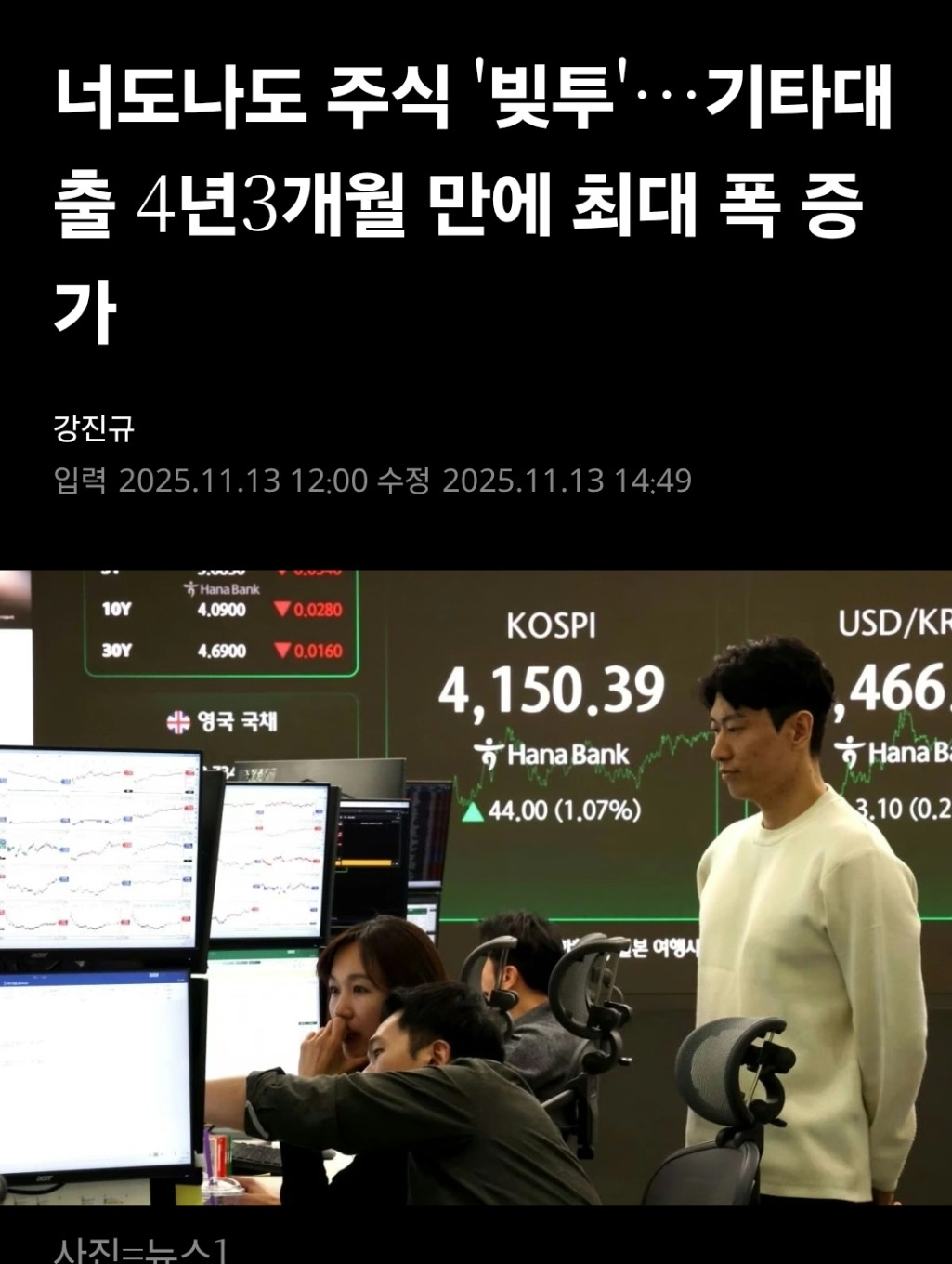 1.주식 빚투가 이어지면서 가계부채가 늘어났다는 기사를 보았습니다. 코스피 4000를 달리면서 상승장에 올라 타기 위하여 영끌을 한다고 합니다.