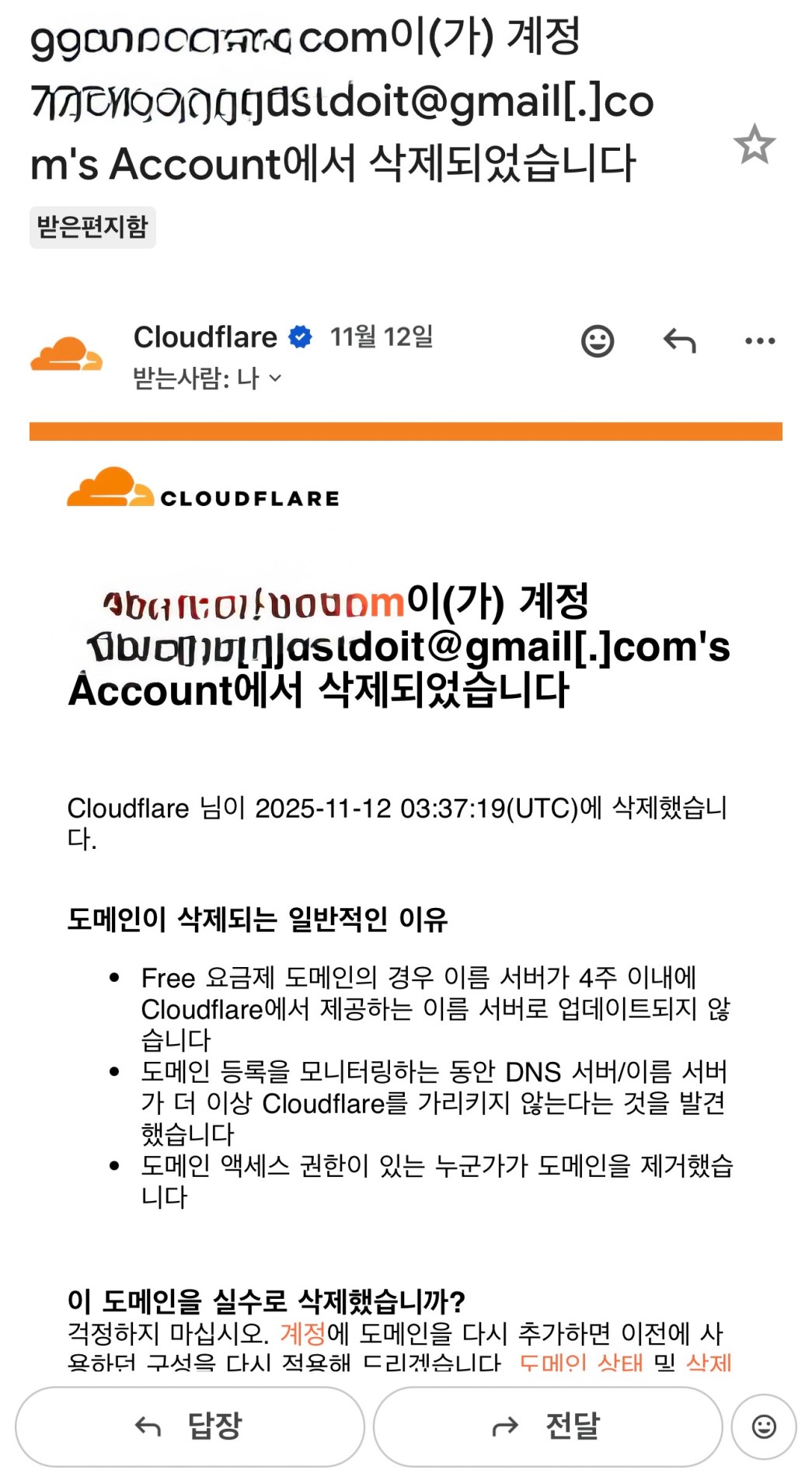 클라우드플레어에서 삭제를 일부러 하신건가요? 왜 이 메일이 오신건지도 알려주시면 좋을 것 같습니다!