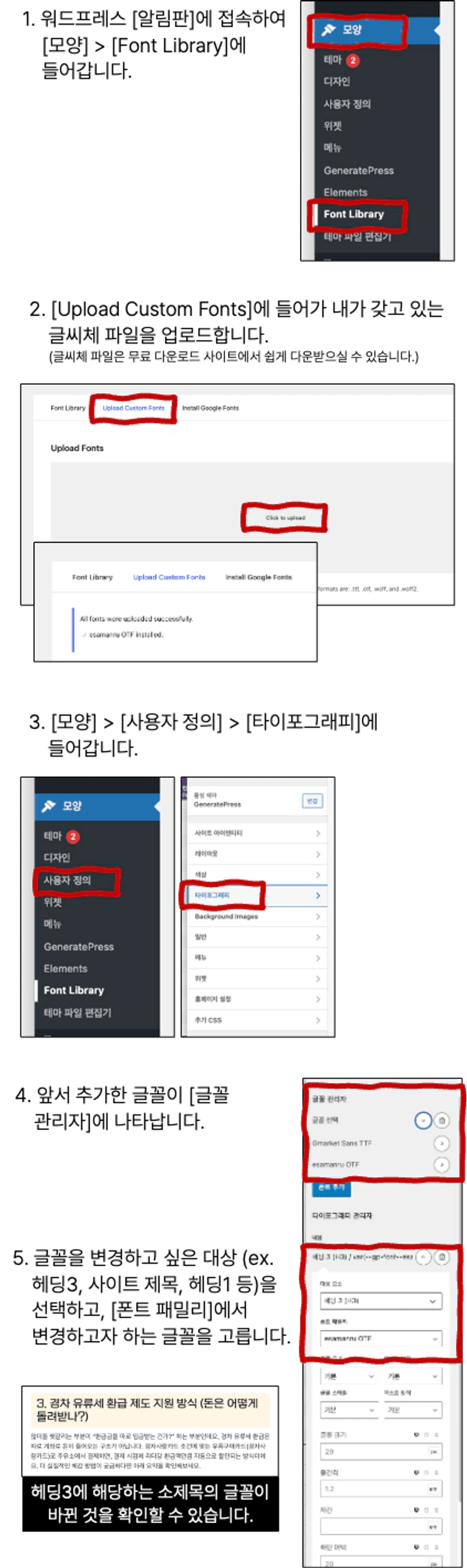 • 워드프레스에 적용되어 있는 기본 글꼴을 내가 원하는 글꼴로 수정할 수 있습니다.