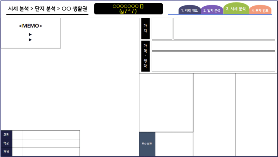 예를 들어 유동인구, 연령대, 단지 및 주변 분위기, 지형 및 상권을 기록할 수 있고
