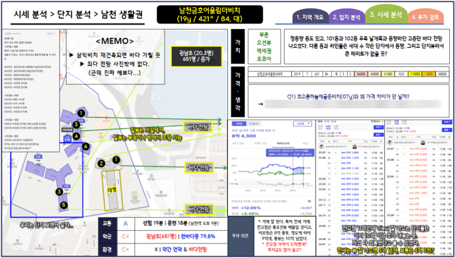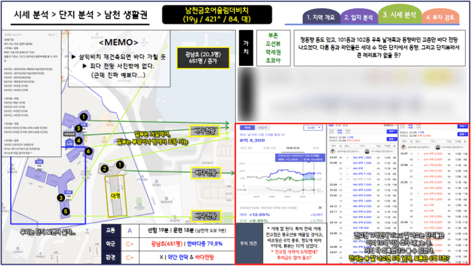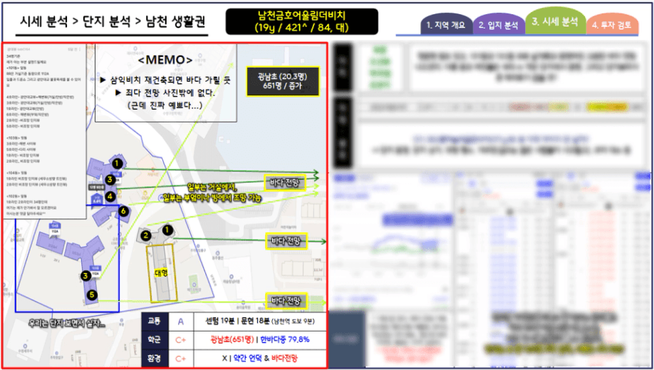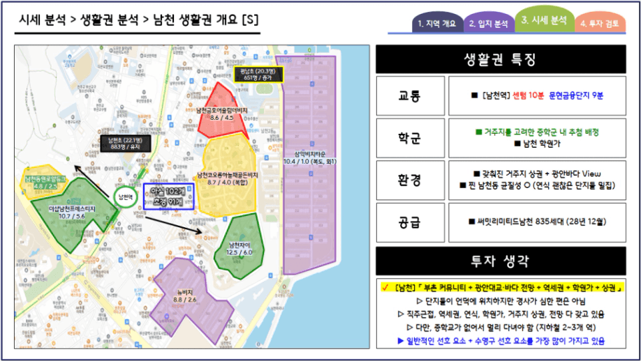 이해를 돕기 위해 부산광역시 수영구 남천 생활권의 단지분석 장표를 가지고 왔습니다.