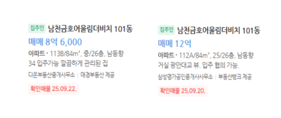 오른쪽 물건은 '거실 광안대교 뷰'를 강조하는 것을 보아
