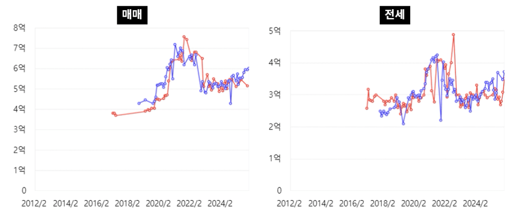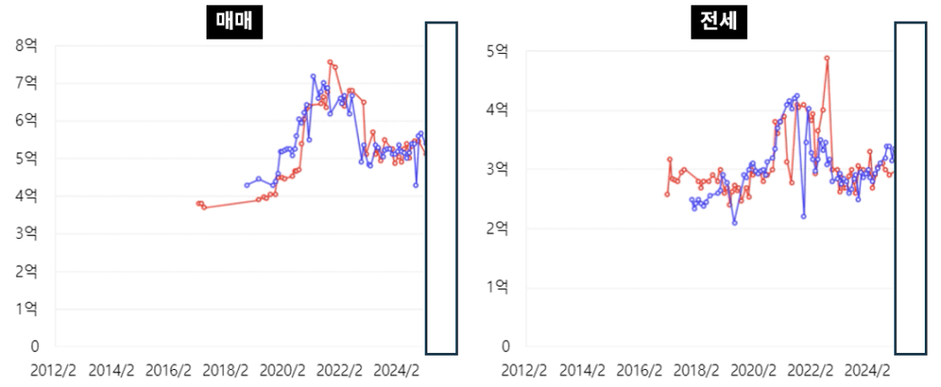 전고점만 보면 빨간 단지가 더 높아보이지만, 상승 흐름은 파란 단지가 더 먼저 붙었네요. 구체적으로 단지의 가치를 이해하면 선택이 쉬울 수 있겠지만 지금 그래프만 보면 어떤 단지를 선택해야 할지 헷갈릴 수 있습니다. 전세 역시 흐름은 비슷해 보이니 투자금도 둘이 크게 다르지 않을 것 같네요. 저는 두 단지 모두 투자 범위에 두고 현장에 방문할 것 같습니다.