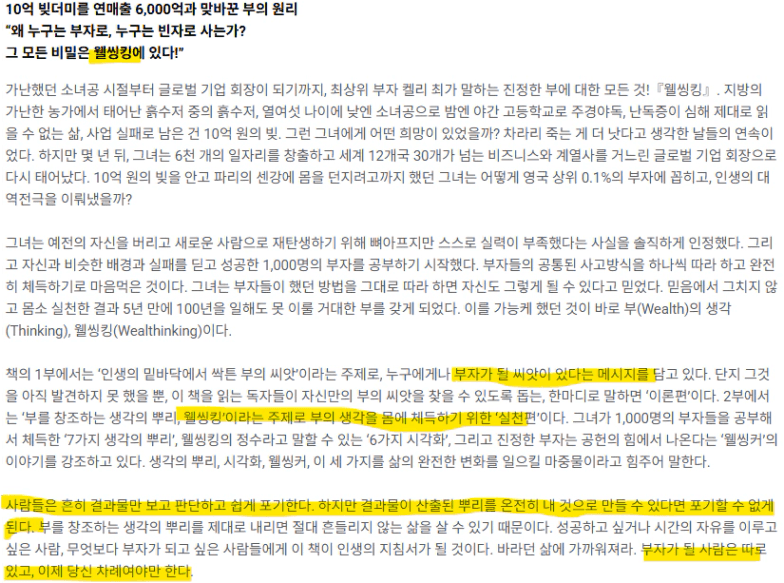 그러나 재독을 하면서 단순히 확언에서 끝나는 것이 아니라, 잠재의식을 바꾸고 생각을 바꿔서 긍정적이고 목표지향적인 삶을 살 수 있도록 하는 것이 웰씽킹임을 알게 되었다.