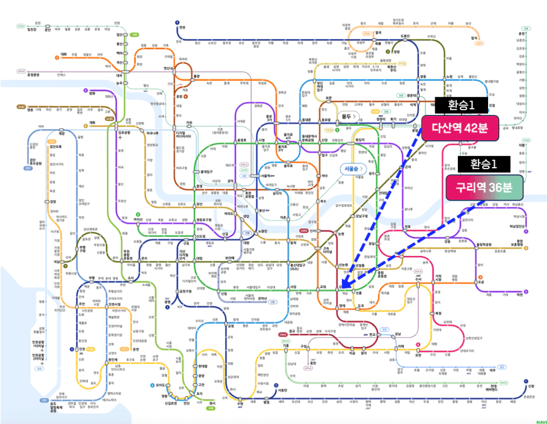구리역 기준으로 36분, 다산역 기준 42분 소요로