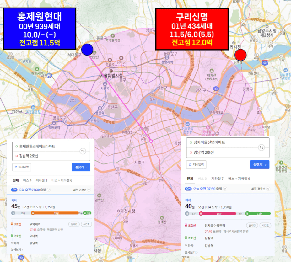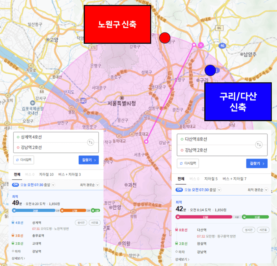노원구의 외곽 신축과 구리/다산 신축을 비교해보면 강남까지 물리적 거리도