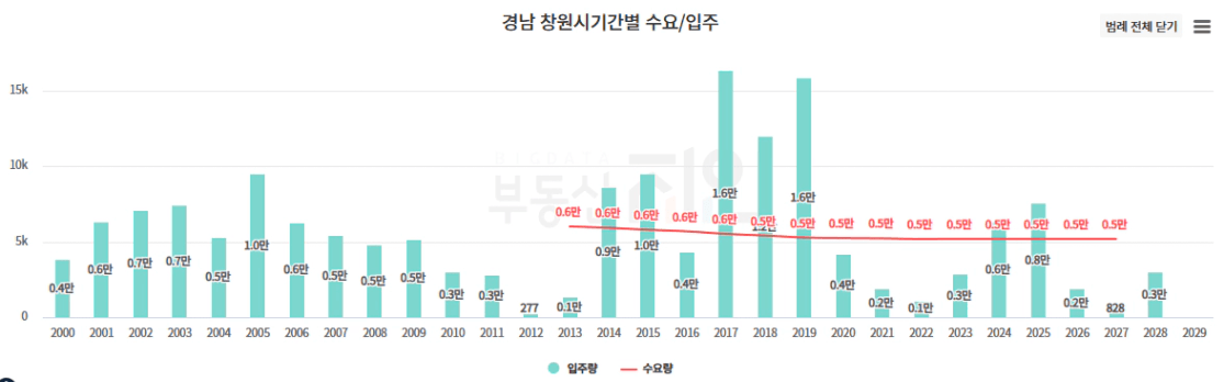25년에 잠시 공급이 많던 창원은 26년부터는 공급이 급격히 줄어듭니다.