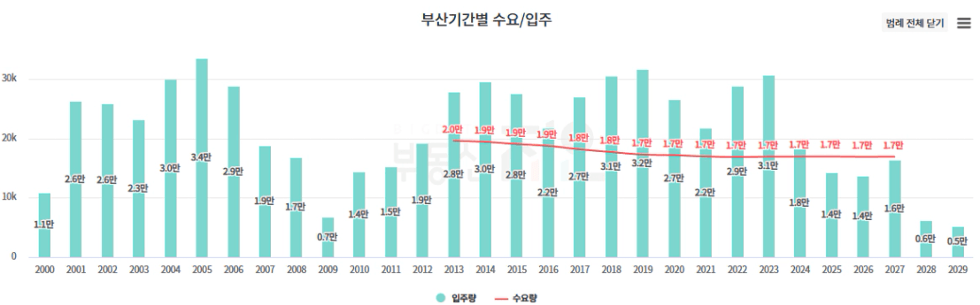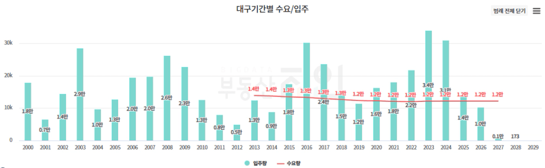 25년까지는 적정수요 이상의 공급이 있으나 26년부터 공급이 줄어듭니다.