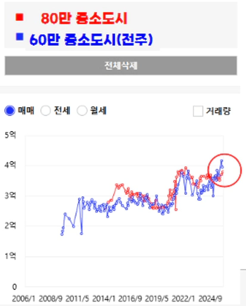 전주는 공급이 줄어들면서 매매가와 전세가가