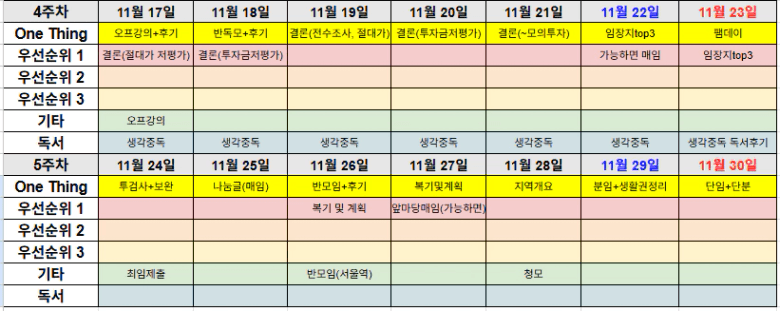 → 원래 계획대로라면 11/9까지 워런버핏을 다 읽었어야 했는데… 이동시간에만 짧게 독서하고 좀 소홀했던 관계로 완독까지 일주일이나 더 걸렸다. 이동시간엔 자꾸 잠 보충을 하려하고 점심시간 독서루틴도 제대로 지켜지지 않아서(…) 부끄럽다…