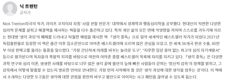 책 제목(책 제목 + 저자) :생각중독+닉 트렌턴