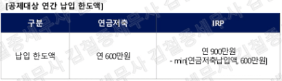 유의하셔야 할 점은 연금저축과 IRP에 얼마씩 납입하느냐에 따라 공제금액이 달라질 수 있다는 점입니다. 그 이유는 연금저축과 IRP 각 납입액에 대한 한도금액이 다르기 때문인데요. 연금저축의 경우 연간 납입한도액은 600만원이며, IRP 연간 납입한도액은 연금저축 납입액과 합하여 900만원이 됩니다.