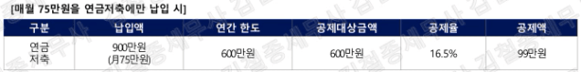 만약 매월 75만원을 연금저축에만 납입했다면 어떨까요? 연금저축 연간 납입액은 900만원이나 한도액은 600만원이므로 한도초과액 300만원은 공제받지 못하고 600만원에 대한 99만원(16.5%)만 공제받게 됩니다.