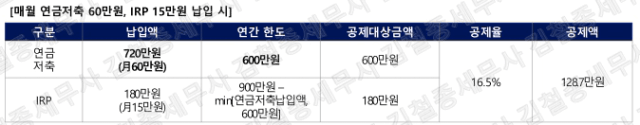 매월 연금저축에 60만원, IRP에 15만원을 납입한다면 어떨까요? 이 역시 연금저축 연간 납입액이 720만원으로 한도초과액 120만원은 공제받지 못하게 됩니다. 결국 연금저축 납입한도액 600만원과 IRP 납입액 180만원, 합하여 780만원에 대해 117만원(16.5%)을 공제받게 될 것입니다.