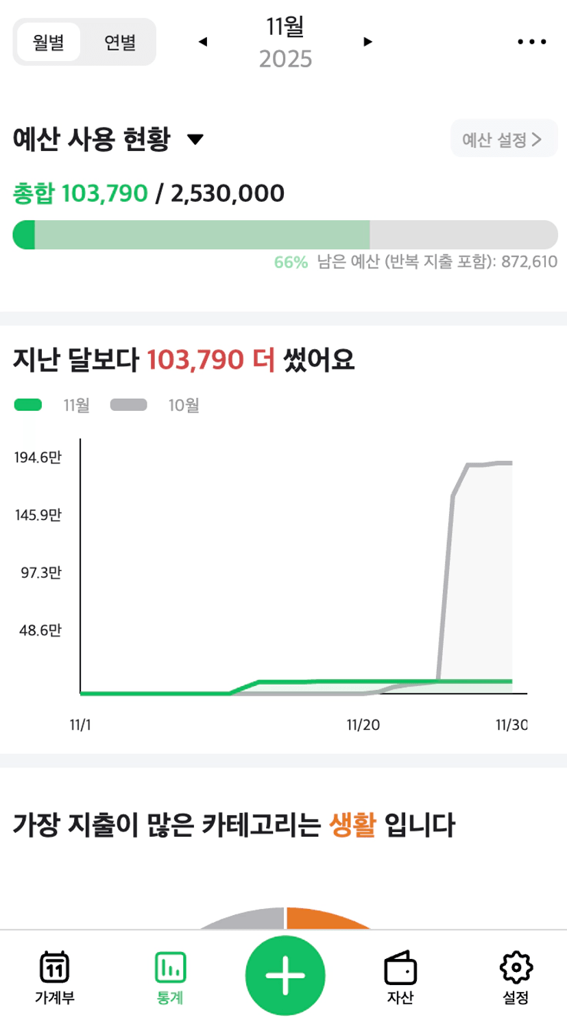 가계부를 직접 입력하고, 주기적으로 통계에 있는 한달 예산 중 얼마가 소진되었는지를 확인할 수 있게 되니까 월말에는 남아있는 예산안에서 맞춰서 생활을 하기 위해 소비를 줄이게 됩니다. 지난 달과의 추이도 비교해서 보여주다보니 이번달에 지출 페이스가 너무 빠른게 아닌지 주의하게 되기도 하구요