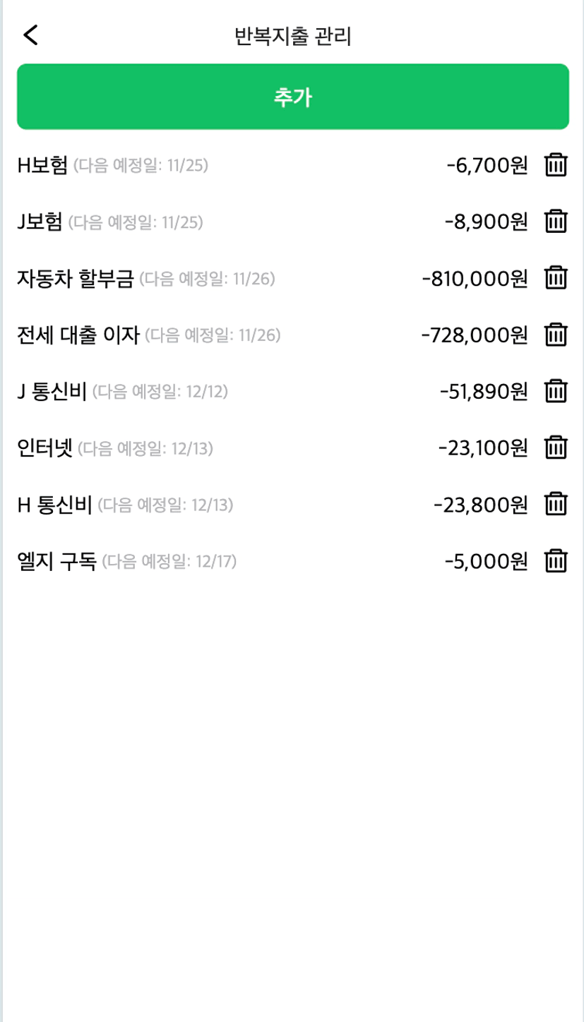• 자동차 보험처럼 연마다 돌아오는 지출은 ‘할부 기능’으로 월 단위 분산 기록