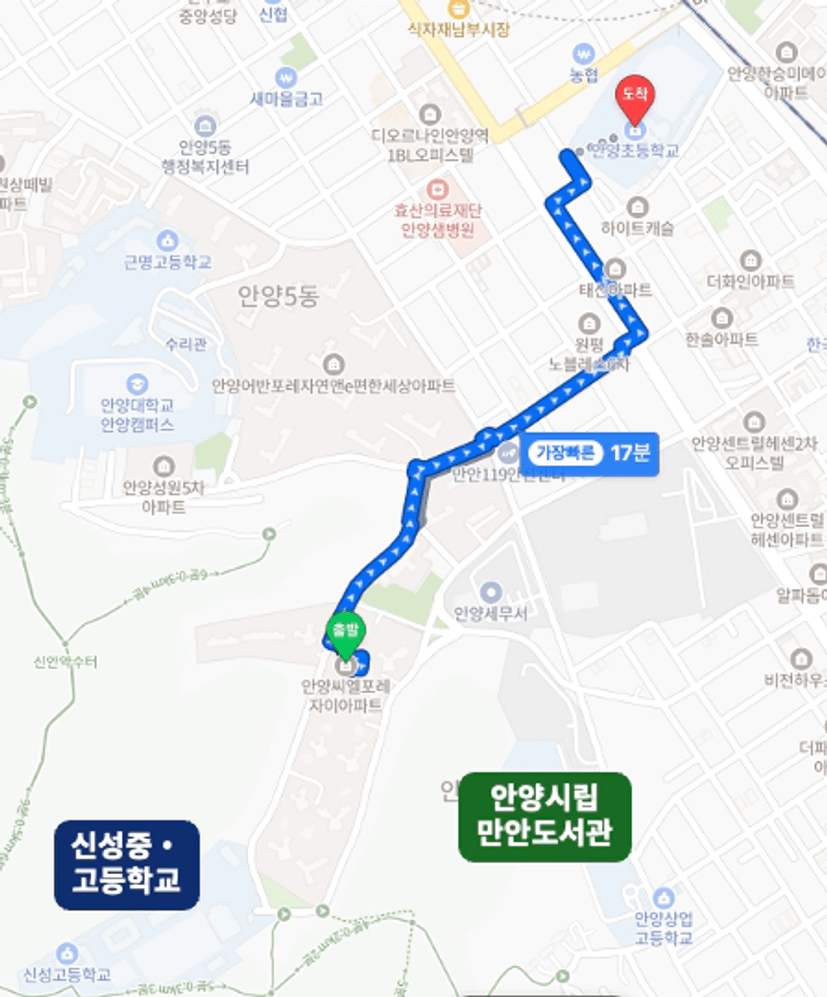 초등학교는 안양초등학교로 배정받는데 도보로 17분 정도 소요되는 거리입니다.