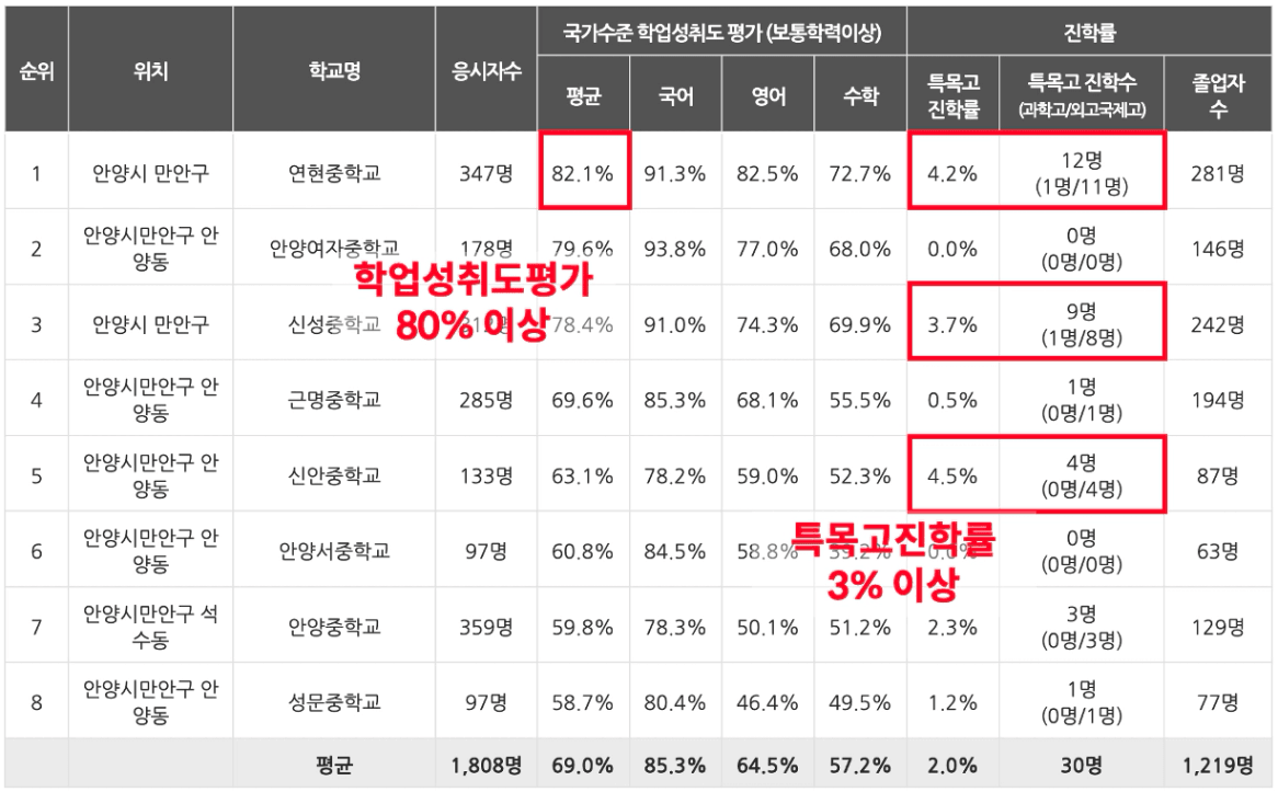 만안구의 중학교는 총8개로 그중 학업성취도 평가 보통학력 이상 비율 80% 이상인 학교는