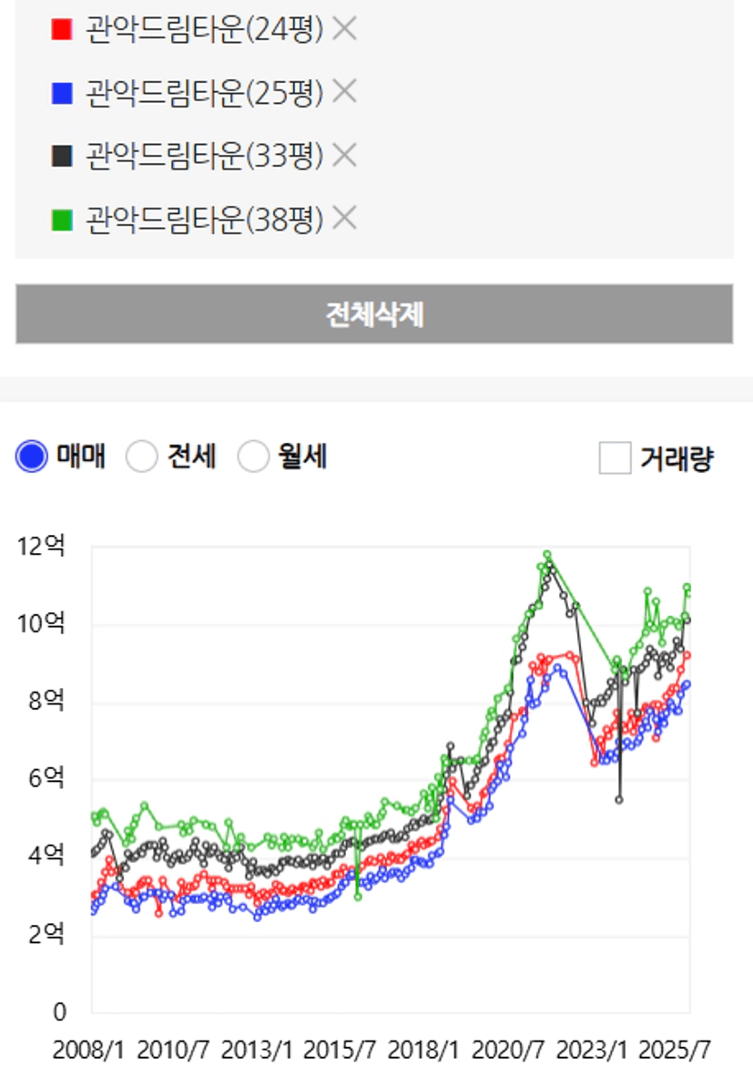 같은 단지 내에서 지금 어떤 평형이 싸고 비싼지가 들어옵니다.
