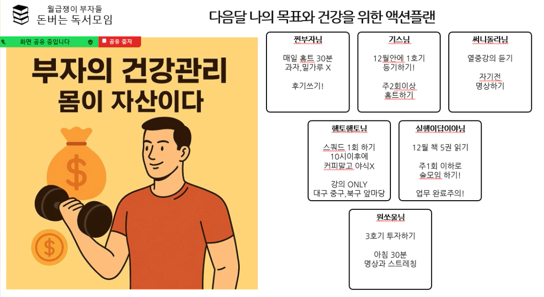 실행님~ 이번달 돈독모 함께 하게 되어서 정말 재밌고 유익했습니다! 많은 경험과 솔직한 이야기 나눠주셔서 감사했습니다! 앞으로 또 환경속에서 만나뵙기를 기대하겠습니다! 12월 목표 5권과 술자리 피하기 파이팅입니다!!