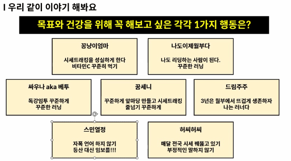 예전에는 너무 할게 많았다고 투덜거렸다면, 이젠 ‘어떻게 하면 할 수 있을까?’ 로 변했다는 허씨허씨 멘토님의말이 깊게 남는데요. 그래서 우리가 정한 이 행동들, 저의 목표와 행동도 어떻게 하면 할 수 있을까를 고민하며 3년간 월부에서 생존하도록 하겠습니다^^ 그것도 뜨겁게! (젖은 낙엽말고 ㅎㅎㅎㅎ 어떻게 가능할까? ㅎㅎㅎ )