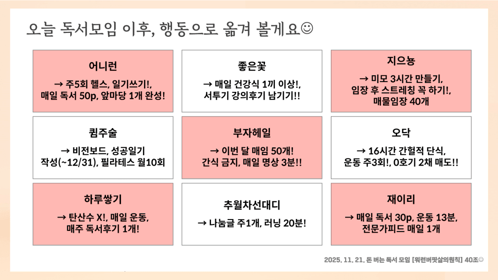 -재이리튜터님 :거침없이 그러면서도 스무스하게 진행을 이어나가시는 모습이 엄청난 경력자이신게 느껴졌습니다. 강의 때도 느꼈던 적극적인 세심함이 이번 독모가 역대급으로 진행될 수 있었던 이유가 아니었을까 싶습니다. 모든 답변에 관심갖고 들어주시고 다시 물어봐주시는 모습을 보고 사람은 저렇게 이끄는거구나를 배울 수 있었습니다. 정말 감사합니다♥️