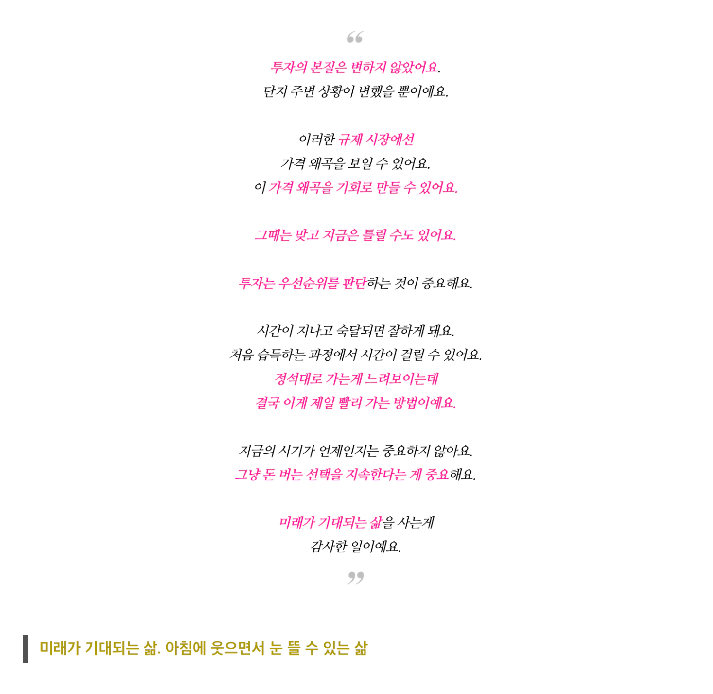 저러한 원칙을 가지고 있어야 우리의 삶이 흔들리지 않을 수 있고 미래를 기대하면서 한걸음씩 앞으로 나아갈 수 있다고 생각합니다. 미래가 기대된다는 말은 어찌보면 매일 매일 행복한 상상으로 본인이 세웠던 목표점을 묵묵히 걸어갈 때 찾아온다고 생각합니다. 그러니 욕심부리지 않고 지금 시장에서 우리들이 할 수 있는 것에만 집중하는 것이 중요할 것입니다. 그러면 결국 행복한 아침을 맞이할 수 있고 그러한 아침들이 쌓여 원하는 미래에 도달할 수 있다고 생각합니다.