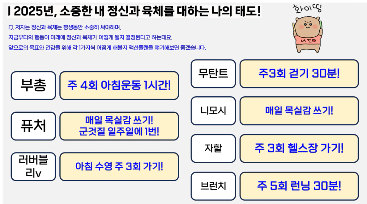 모두들 자신의 위치와 상황에서 할 수 있는 것들에 집중하고 계신 모습들도 매우 인상적이었다. 각자의 상황에 따라 와닿는 문장과 그에 따른 이유들을 듣고 나에게 적용해 볼 점을 찾을 수 있었고, 러버블리님의 목실감 작성 방법을 들으며, 꼭 한 줄이라도 매일 목실감을 작성해야 겠다고 생각했다. 조원들의 고민에 진심으로 공감해주시고, 답변을 해주신 부총튜터님께는 감사한 마음이 들었고, 나는 누군가의 생각과 의견에 이렇게 진심으로 경청한 적이 있었나? 라는 생각이 들어 잠시 반성을 하기도 했다.