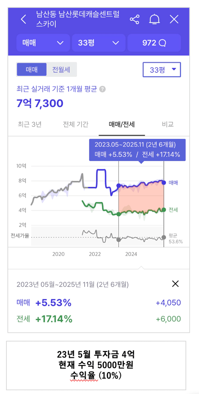 하지만 이 아파트의 경우는 상위 생활권에 아직 전세가 오르지 않았기 때문에 4년이상 장기 보유를 해도 괜찮다고 생각한다.