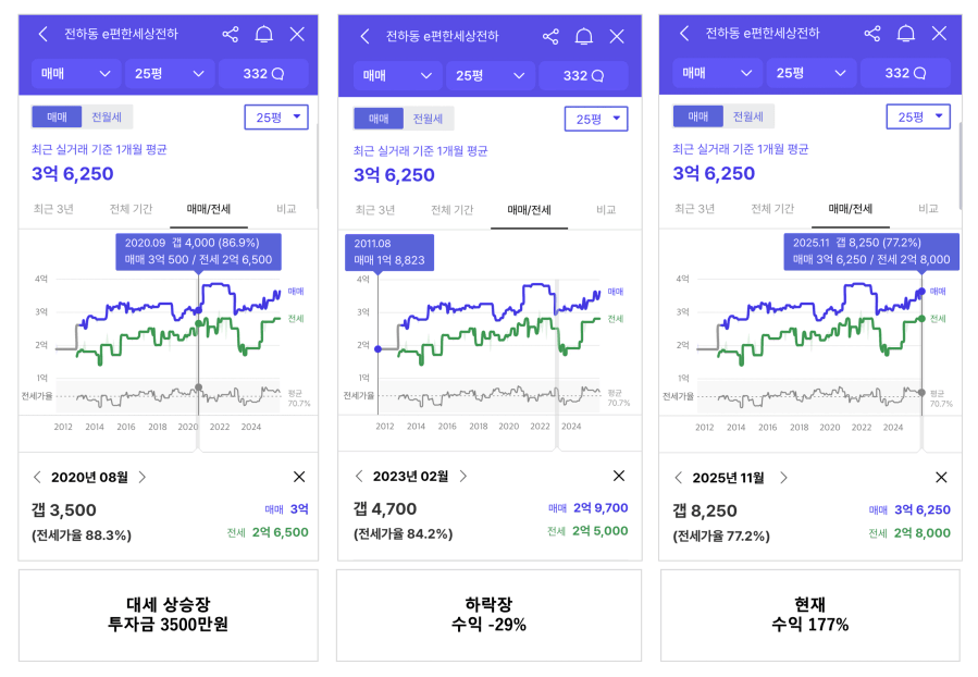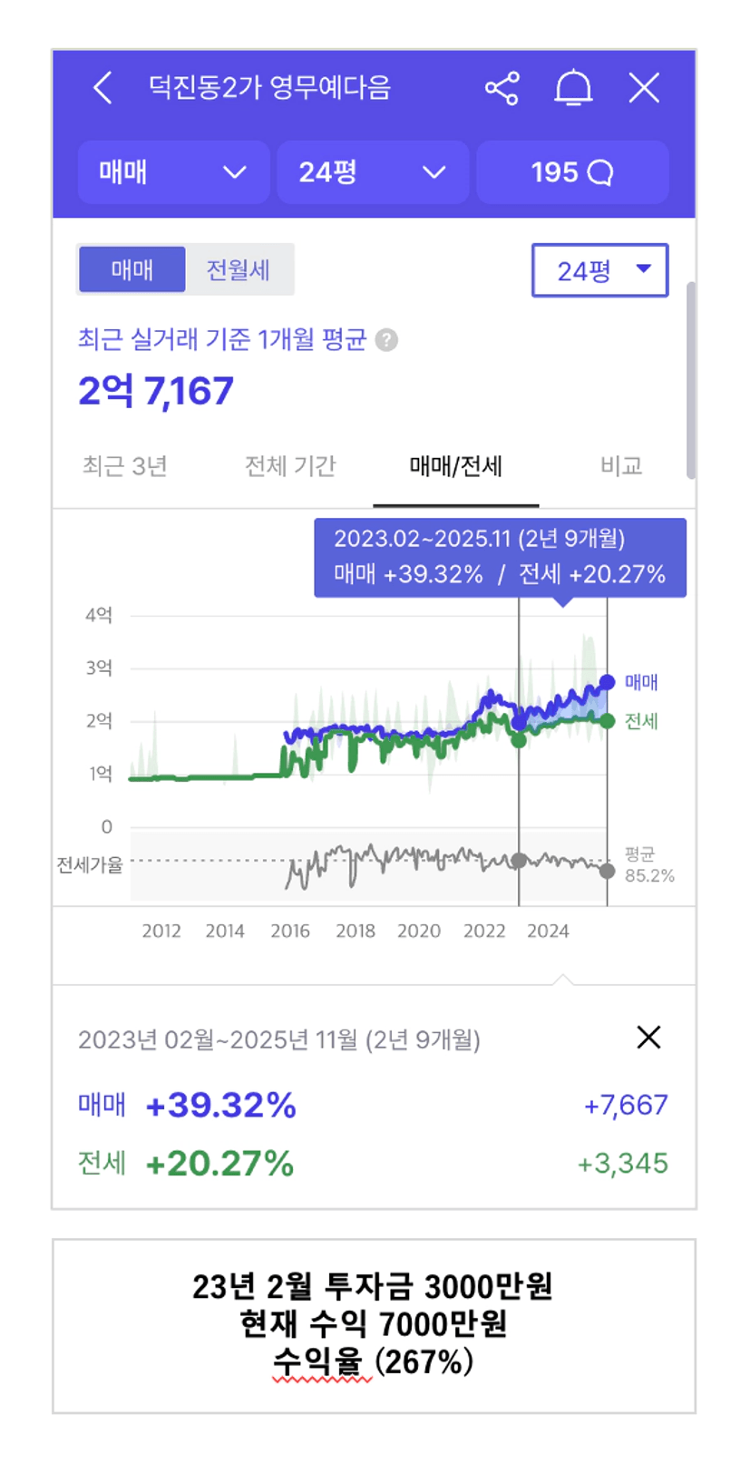 예를 들어 전주 아파트를 생각해보자  덕진구 영무예다음이라는 아파트 25평을 23년 2월에 매수했다고 하면 현재 수익율을 267%이다. 이런 단지의 경우 단지의 가치가 적고 연식도 빠지기 때문에 4년이 지나지 않았어도 매도를 하는게 더 좋다.