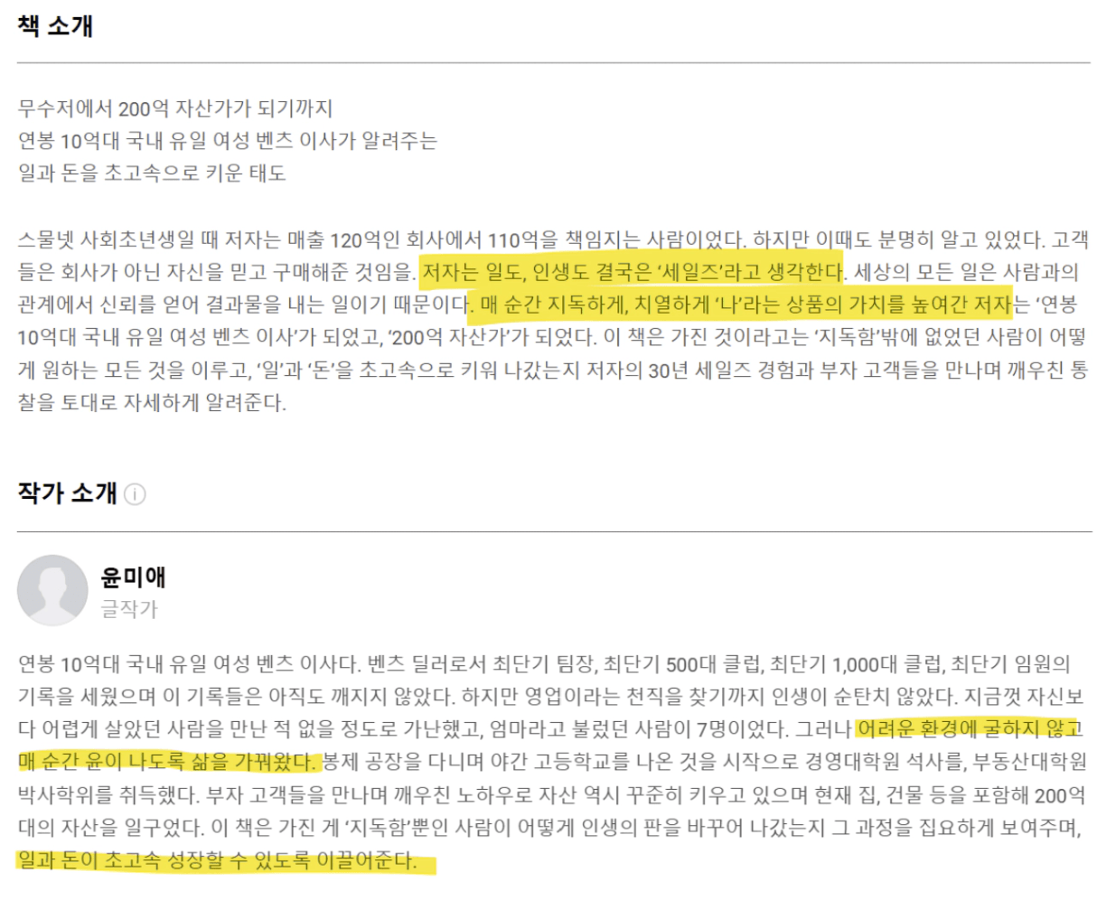 이 책을 처음 읽을 땐 저자의 놀라운 아웃풋 (전설의 벤츠 딜러라던가, 10억 연봉이라던가, 200억대 자산가, 압구정현대 자가 등등)에 먼저 혹했다. 그런데 저자의 삶 전반을 들여다보고 나면, 그런 것들보다 더 대단한 저자의 열정과 그릿으로 가득 찬 삶 자체에 조망하게 되는 것 같다. 누구나 포기하고 싶고 포기해도 마땅하다고 여겨질법한 상황들을 저자는 많이 만났다. 그럼에도 불구하고 거기에서 어떻게 하면 다음을, 더 나은 내일을 그릴 수 있을까?에 대한 끊임없는 노력들이 하루하루를 그렇게 수 십 년의 세월을 채워온 것 같다. 이제는 하루를 온전히 다 쏟아내는, 열정 넘치는, 뜨겁게 보내는 하루하루가 저자에겐 기본값이 된 것 아닐까?간절하면, 정말 간절하면 현실로 이루어진다고 한다. 달리 말하면, 내가 만일 원하는 모습이 지금 내게 펼쳐지지 않고 있다면 나는 생각만큼 간절하게 그것을 원하지 않았는지도 모른다. 이 정도 온도로는 물이 끓어지지 않는지도 모른다. 저자에게 배울 것들은 한두가지가 아니다.