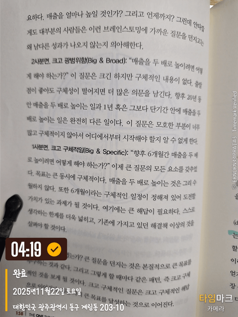 그러니 망설이지 말고 당장 시작하라. 자신에게 이렇게 물어라. “ 다른 모든 일을 더 쉬워지거나 필요 없게 만들, 지금 당장 시작할 수 있는 내인생의 단 하나는 무엇인가?”