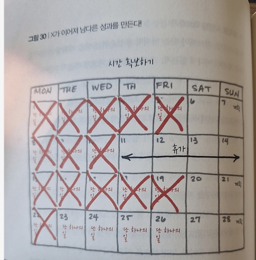오늘 내가 해야 하는 단 하나의 일은? 그날 내가 당장 해야하는 것에서 매일매일 66일 이상 습관을 들때까지 꾸준하게 최선을 다하면서 해가도록 한다. (매일 매일 원씽을 체크 한다.)