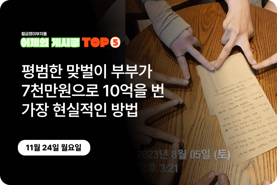 [어제의 게시글 Top5] 평범한 맞벌이 부부가 7천만원으로 10억을 번 가장 현실적인 방법
