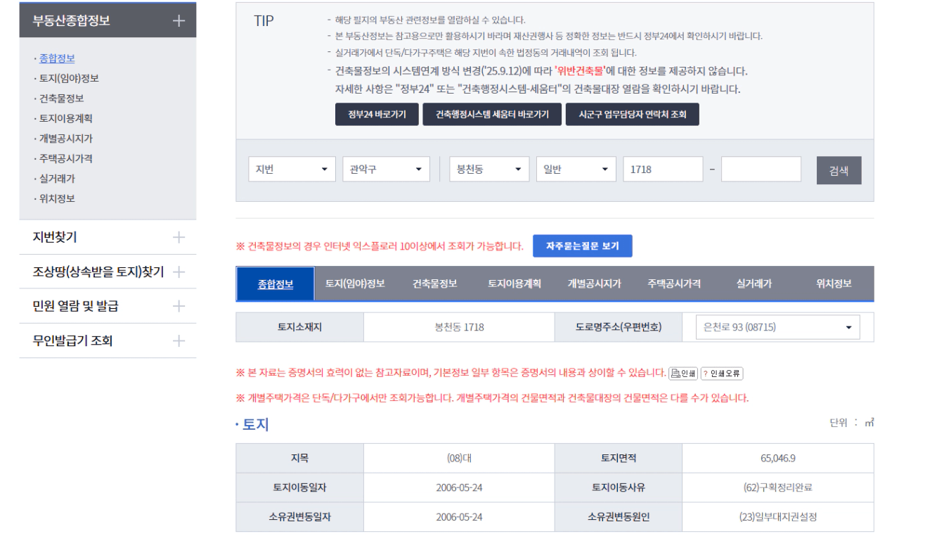 이렇게 입력만 해도 토지 정보부터 건축물 정보까지 모든 공적 자료를 한눈에 조회하실 수 있습니다.