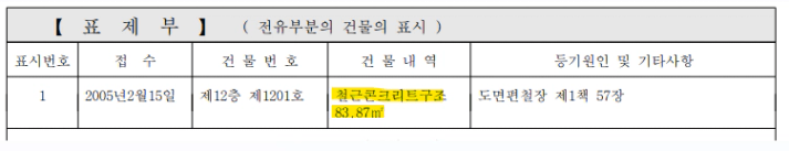 17번 ‘정착물의 내용’ 등기부 등본상 아파트의 건물 내역전용면적을 적어줍니다.