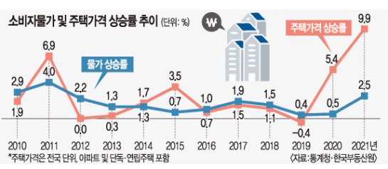 물가상승률과 주택가격 상승률에 대한 그래프를 갖고 왔습니다.