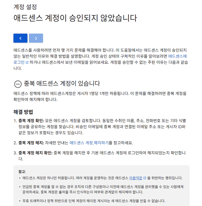 참고로 저는 다른 블로그를 사용한적도 없고, 구글애드센스 신청도 이번에 처음 한거라서 중복계정을 어떻게 확인해 서 삭제하면 되는지 궁금합니다. 근데 헷갈리는거는 아래 중복계정이라고 나오는 내용이 제 계정에 관련된 것인지? 일반적인 불승인 사유로 언급된 것인지도 잘 모르겠네요. 의견부탁드립니다.