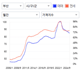 부산은 전세지수 (붉은선)가 살짝 꼬리를 들고 반등하고 있습니다:)