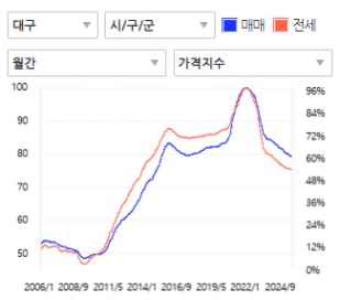 대구는 매매가는 슬금슬금 오르고 전세가는 오히려 빠지고 있어 투자금이 벌어지고 있었고,