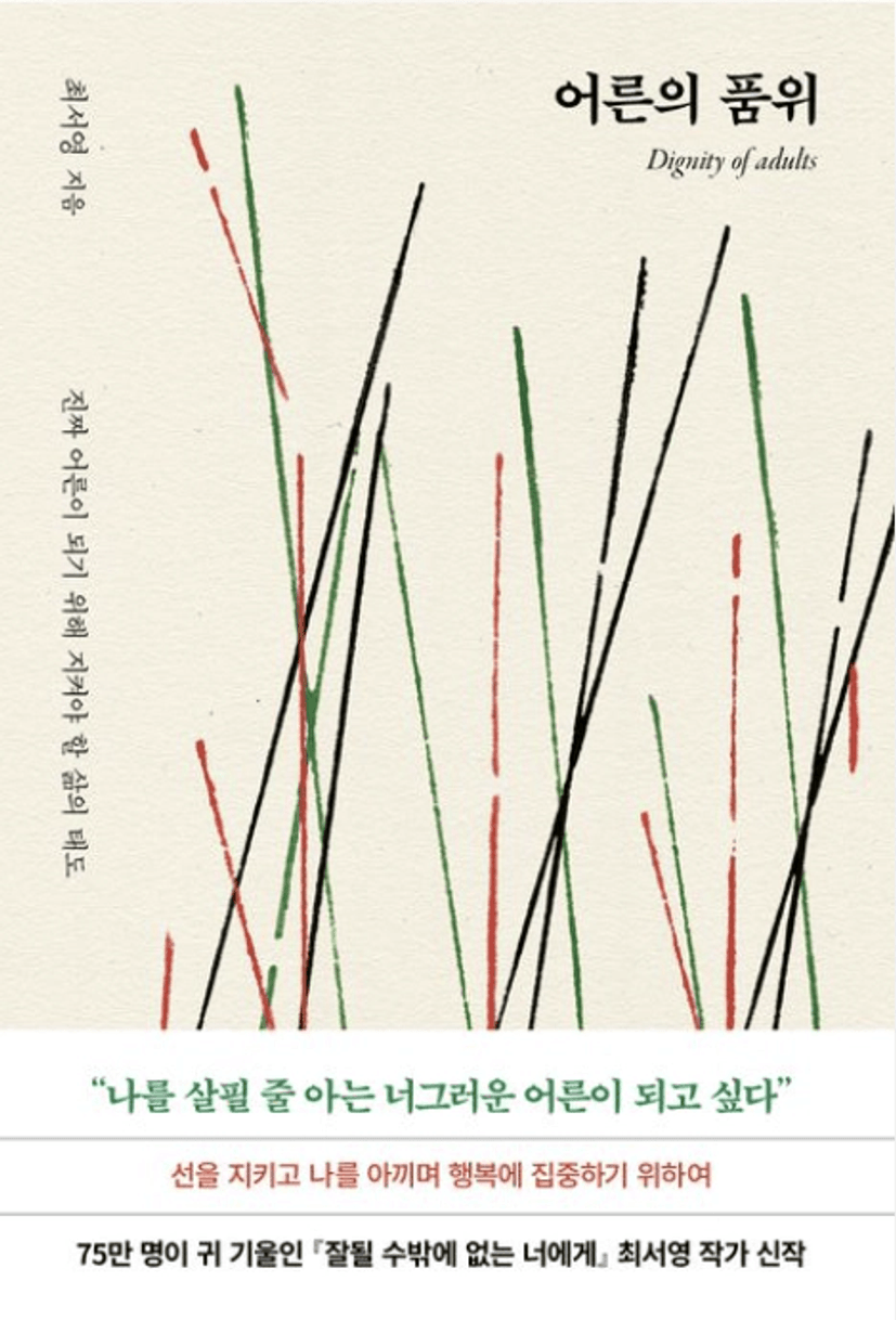특유의 솔직함과 밝은 에너지를 가진 최서영 작가도 나이를 한 살 한 살 먹으며 ‘어떻게 살아야 잘 사는 걸까요?’라는 오래된 질문을 붙들고 삶의 태도에 대해 깊이 고민해왔다. 성별, 연령, 직업이 모두 다른 다양한 사람을 만나다 보니 주변의 ‘나이만 많은 사람’과 ‘진짜 어른’의 차이가 바로 ‘품위’라는 것을 자연히 알게 되었다. 그래서 품위에 대해 천천히 다방면으로 생각하게 된 작가는 ‘품위’는 일차원적인 겉모습이나 거창한 장식이 아니라 마음가짐, 말투, 태도, 자세, 신념, 눈빛 등 생각에서 배어 나온다는 사실을 깨닫게 되었다. 그래서 나 자신을 돌보고 단련하며 누구에게서나 배울 점을 찾는 태도가 가장 중요하다는 것을 이제야 깨닫는 중이라고 말한다.