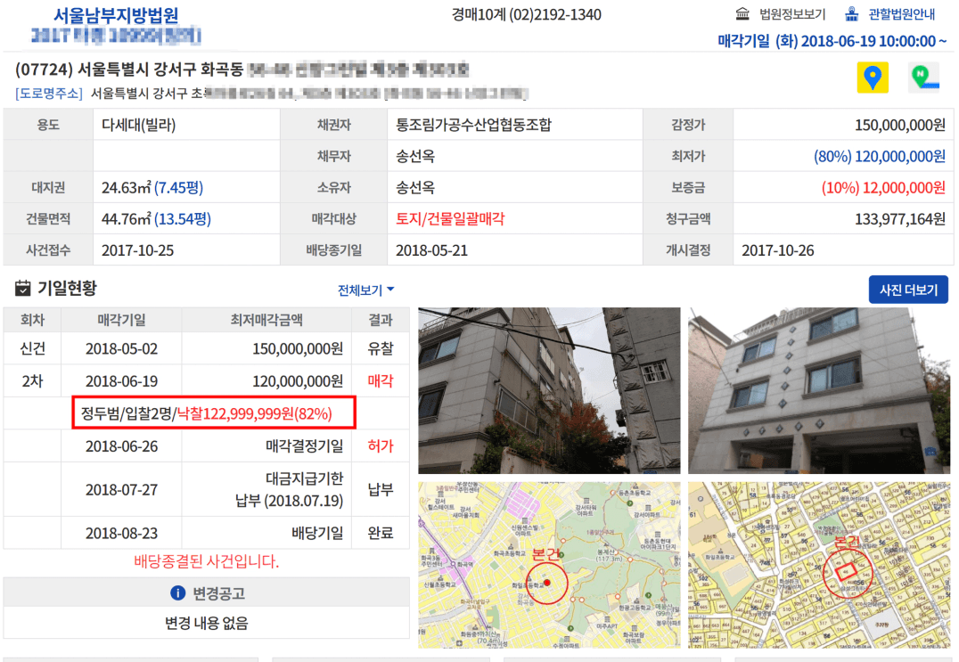강서구 화곡동의 한 빌라를 123,000,000원에 낙찰 받습니다.