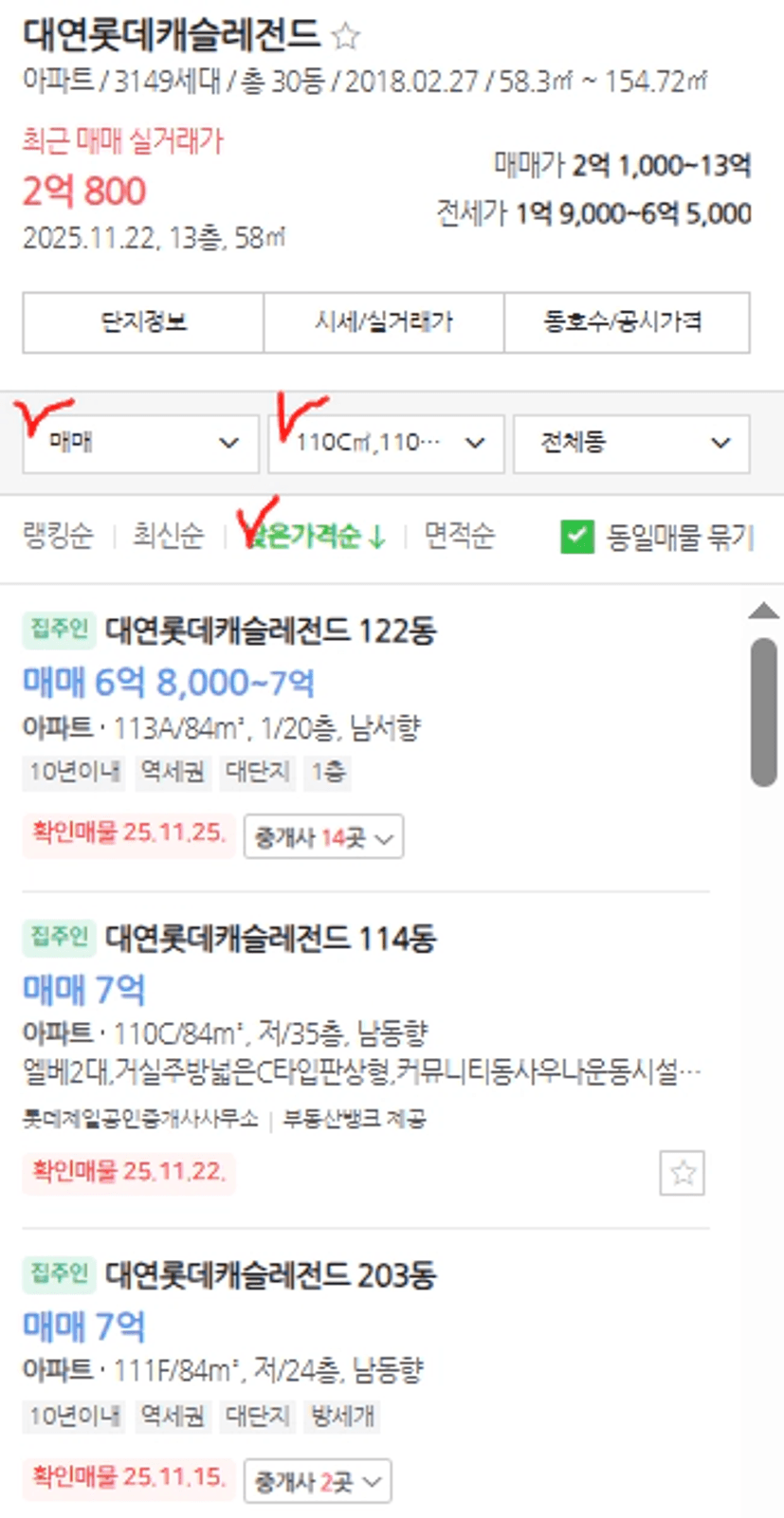 그리고 원하는 평형을 고르고, 낮은 가격순으로 나열합니다.