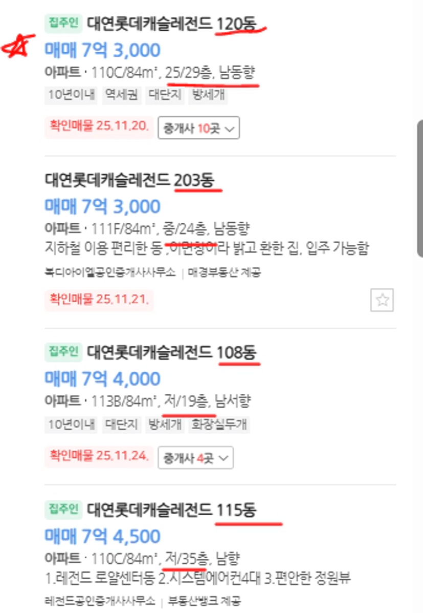 어? 120동이랑 203동의 물건들은 중층이상인데 7.3억이네,
