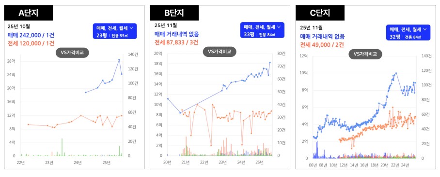 여기 서울의 A, B, C 3개의 단지가 있습니다.