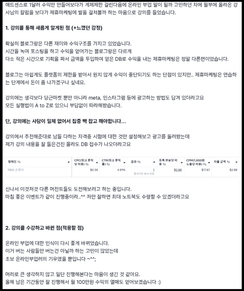② 시간을 녹이는 블로그 수익화와는 다르게 제휴마케팅은 바로 광고 기획을 한 뒤 광고를 올리면 되는 부분이기 때문에 강의를 듣고 바로 광고를 올려보셨습니다.
