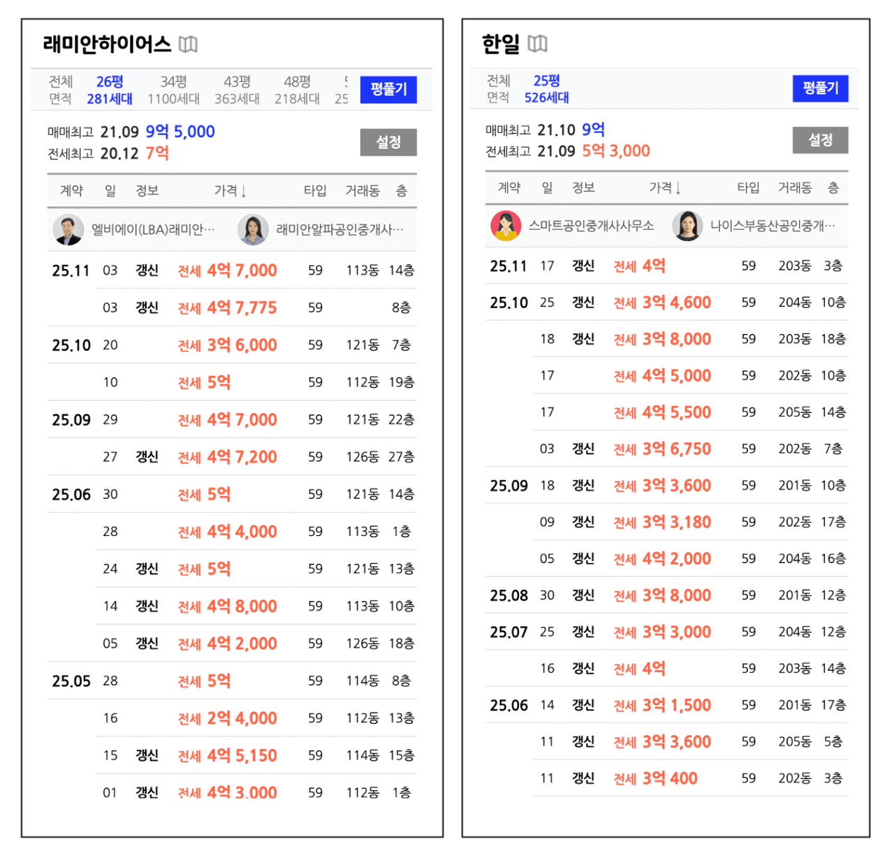 그에 비해 한일은 4.5억이 신규 전세임을 알 수 있는데요